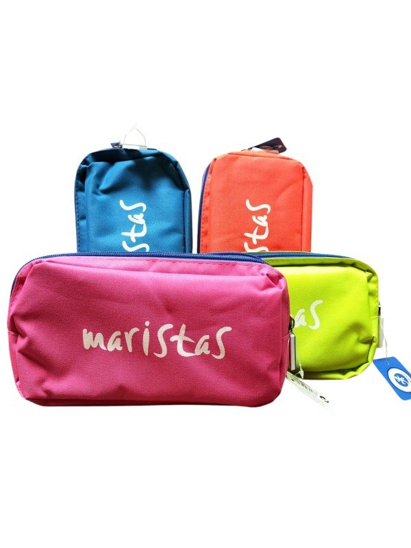 Estuche escolar de dos cremalleras con la palabra “maristas” serigrafiada. De gran capacidad, dispone de dos compartimentos para guardar el material escolar. Disponible en varios colores.