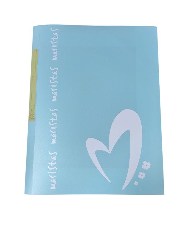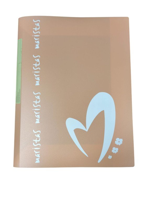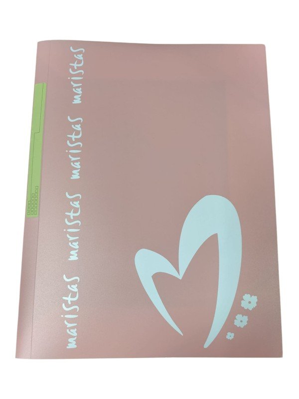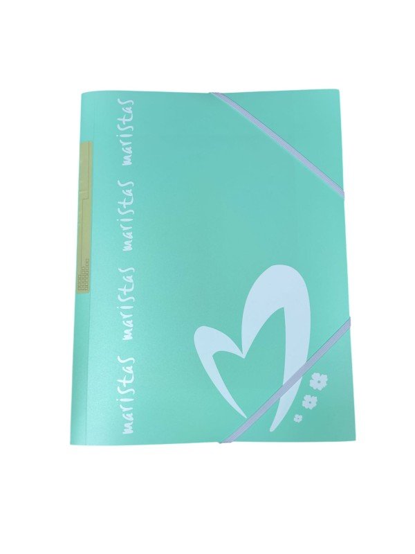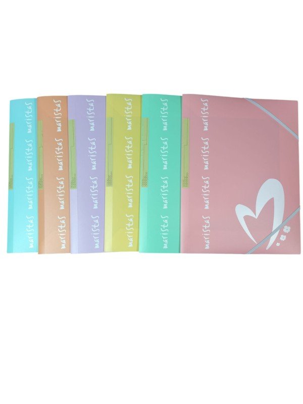Carpeta tamaño A4, fabricada en plástico en colores pastel. Tiene gomas y solapas y está personalizada con Maristas.
